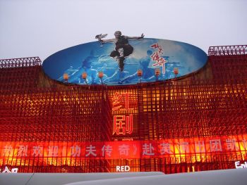 Nach dem anstrengenden Vormittag hatten wir uns das Mittagessen redlich verdient. Nach einer kurzen Fahrt erreichten wir den „Golden Palace“, wo uns verschiedene chinesische Gerichte serviert wurden. Fast alle machten sich mit Stäbchen darüber her, einigen war die Gabel aber doch vertrauter. Falls doch jemand von uns sich mit der Schweinegrippe oder etwas anderem angesteckt haben sollte, so waren sämtliche Erreger auf jeden Fall nach dem Genuss des ebenfalls zum Essen gehörigen Reisschnaps weggeätzt ;-) Im Erdgeschoss des Gebäudes wurde dann der Fabrikverkauf einer Porzellanfabrik – von einigen mehr, von anderen weniger – geplündert. Zum Abschluss des Ausflugs fuhren wir wieder nach Peking zurück, um uns das Olympiagelände sowie das Olympiastadion anzusehen. Inzwischen war sogar über Peking blauer Himmel zu sehen, sodass bei klarer Sicht das „Vogelnest“ fotografiert und betrachtet werden konnte. Nach knapp einstündigem Aufenthalt im Hotel ging es dann für ca. 20 Teilnehmer zur Peking-Oper, die im Liyuan-Theater des Qian Men Hotels aufgeführt wurde. Die Busfahrt wurde – wie meistens – vom Stau auf der Ringstraße bestimmt.