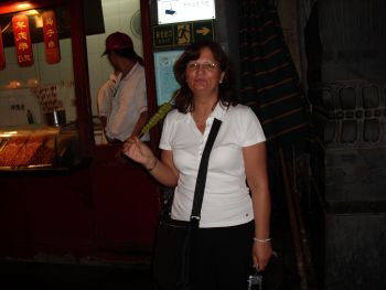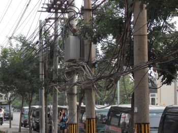 Es ist sehr warm hier (heute ca. 36 Grad), theoretisch scheint auch die Sonne, wir sehen sie nur wegen des Dunstes (Smog) nicht wirklich. Mit dem Essen haben wir uns schon angefreundet, Frühstücksbüffet und Abendessen haben gut geschmeckt, es gab auch nichts, was noch gezappelt hat ;-) Nur auf einem Markt haben wir noch lebende Langusten gesehen. Ansonsten waren eher wir die Exoten auf dem Markt, Sylvia und ich wurden von den Chinesen angeschaut wie zwei Außerirdische ... Die Deutschen werden hier übrigens "Langnasen" oder auch "Kuhaugen" genannt! Von unserem Reiseführer haben wir außerdem gelernt, wie man die Asiaten an der Augenstellung unterscheiden kann: Chinesen = zwanzig nach acht Unterwegs am ersten Tag haben wir u. a. auch schon sehr aufschlussreiche chinesische Verkehrszeichen sowie die interessante Stromkabelverlegung bewundert. Außerdem haben wir Sylvia unter die Haube gekriegt ... aber seht selbst *g*